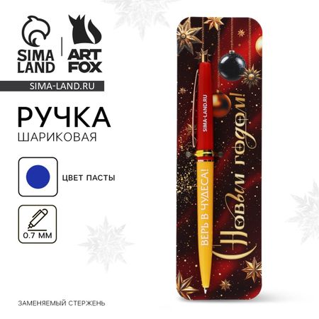 Ручка шариковая, синяя паста, 0.7 мм, автоматическая «С Новым Годом». Ручка торговой марки ArtFox отлично подойдет в качестве подарка. Яркий дизайн несомненно привлечет внимание и будет выделяться среди других предметов, а удобная форма корпуса позволит использовать ее с комфортом. <ul> <li> Вид ручки: шариковая;</li> <li> Цвет стержня: синий;</li> <li> Стержень заменяемый: да;</li> <li> Материал: пластик;</li> <li> Форма корпуса: круглая.</li> </ul> Упаковка: пакет.