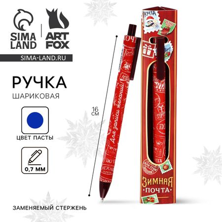 Ручка шариковая, синяя паста, 0.7 мм, автоматическая, матовая, в конверте «Новый год: Зимняя почта». Ручка торговой марки ArtFox отлично подойдет в качестве подарка. Яркий дизайн несомненно привлечет внимание и будет выделяться среди других предметов, а удобная форма корпуса позволит использовать ее с комфортом. <ul> <li> Вид ручки: шариковая;</li> <li> Цвет стержня: синий;</li> <li> Стержень заменяемый: да;</li> <li> Материал: пластик;</li> <li> Форма корпуса: круглая.</li> </ul> Упаковка: пакет.