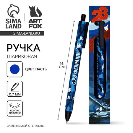 Ручка шариковая, синяя паста, 0.7 мм, автоматическая, в конверте «23 февраля». Ручка отличное дополнение к подарку. Яркий дизайн несомненно привлечет внимание и будет выделяться среди других предметов, а удобная форма корпуса позволит использовать ее с комфортом. <ul> <li> Стержень заменяемый: да;</li> <li> Материал: пластик.</li> </ul>