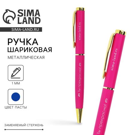 Ручка шариковая, синяя паста, 1.0 мм, металлическая «Ты прекрасна!». Ручка отличное дополнение к подарку. Яркий дизайн несомненно привлечет внимание и будет выделяться среди других предметов, а удобная форма корпуса позволит использовать ее с комфортом. <ul> <li> Цвет стержня: синий;</li> <li> Стержень заменяемый: да;</li> <li> Материал: металл;</li> <li> Форма корпуса: круглая.</li> </ul>