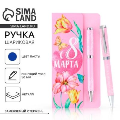 Ручка шариковая, синяя паста, 1.0 мм, на открытке металл, 1 мм «С 8 марта». Ручка отличное дополнение к подарку. Яркий дизайн несомненно привлечет внимание и будет выделяться среди других предметов, а удобная форма корпуса позволит использовать ее с комфортом. <ul> <li> Цвет стержня: синий;</li> <li> Стержень заменяемый: да;</li> <li> Материал: металл;</li> <li> Форма корпуса: круглая.</li> </ul>
