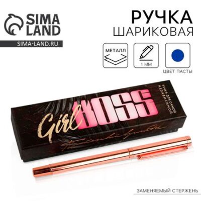 Ручка шариковая, синяя паста, 1.0 мм, розовое золото металл в подарочной коробке Girl Boss. Ручка отличное дополнение к подарку. Яркий дизайн несомненно привлечет внимание и будет выделяться среди других предметов, а удобная форма корпуса позволит использовать ее с комфортом. <ul> <li> Цвет стержня: синий;</li> <li> Стержень заменяемый: да;</li> <li> Материал: металл;</li> <li> Форма корпуса: круглая.</li> </ul>