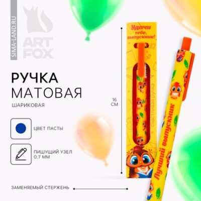Ручка шариковая, синяя паста, матовый корпус, автоматическая в конверте, 0.7 мм «Удачи тебе, выпускник!». Автоматическая матовая шариковая ручка станет отличным помощником в учебных делах. <ul> <li> Толщина линии письма: 0,7 мм;</li> <li> Цвет чернил: синий;</li> <li> Форма корпуса: круглая;</li> <li> Ручка разборная.</li> </ul>