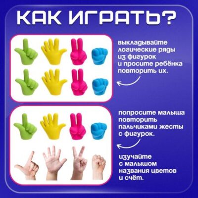 Счетный материал «Жесты». Счетный материал «Жесты» состоит из 40 цветных фигур. <b> Как пользоваться набором?</b> <ul> <li> Попросите кроху выложить свои визуально-жестовые ряды из фигурок и повторить их.</li> <li> Тренируйте у малыша межполушарное взаимодействие. Попросите его выполнять разные жесты обеими руками одновременно.</li> <li> Изучайте с малышом названия цветов и счет.</li> <li> Фантазируйте и придумывайте свои задания для крохи.</li> </ul> <b> Польза занятий со счетным материалом «Жесты»</b> С такой игрой ребенок научится считать, запомнит названия всех пальчиков, повторит цвета, а также потренирует мелкую моторику, логическое мышление и память. Рекомендовано детям от 3 лет.