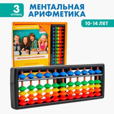 Счеты с пособием по ментальной арифметике 10-14 лет. <strong> Учимся быстрому счету! </strong> Ментальная арифметика — программа развития умственных и творческих способностей, основанная на системе устного счета. Освоив эту программу, ребенок сможет решать арифметические задачи всего за несколько секунд. Для понимания сути методики счета пригодится абакус. ПРЕИМУЩЕСТВА: <ul> <li> развитие левого полушария за счет стимуляции мелкой моторики рук и наглядного представления результатов вычисления;</li> <li> развитие правого полушария мозга благодаря счету в уме, а также работе на счетах как правой, так и левой рукой;</li> <li> улучшение успеваемости по всем предметам;</li> <li> развитие способности добиваться успехов в любом деле;</li> <li> тренировка нейронных связей головного мозга ребенка;</li> <li> развитие скорости и качества мышления. В СЕРИИ 3 СТУПЕНИ: <ul> <li> 1 СТУПЕНЬ (3-6 лет): знакомство с цифрами, простые примеры на сложение и вычитание на абакусе</li> <li> 2 СТУПЕНЬ (6-10 лет): продолжаем изучать абакус, сложные примеры на сложение и вычитание</li> <li> 3 СТУПЕНЬ (10-14 лет): изучение умножения и деления на абакусе</li> </ul> </li> </ul>