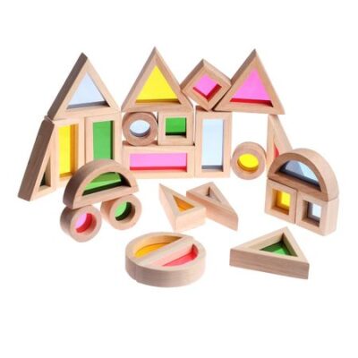 Сенсорный конструктор «Радужные блоки». Сенсорный конструктор «Радужные блоки» состоит из 24 деревянных блоков с прозрачными цветными акриловыми вставками. Детали изготовлены из прочной фанеры. В наборе есть 6 различных форм: квадраты, прямоугольники, полукруги и прямоугольные треугольники (4 прозрачных цвета — розовый, синий, зеленый, желтый). Малыш будет строить из радужных блоков разные фигуры. Отличительной чертой является то, что можно смотреть через прозрачные окошки деталей. Во время игры ребенок задействует творческие и исследовательские навыки. В процессе построения и выбора блоков дети изучают простые математические концепции формы, баланса и размеров. Также малыш может наблюдать за изменением цвета, наложив две детали друг на друга. Рекомендовано для детей от 3 лет.