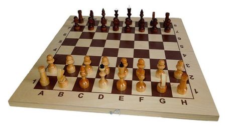 Шахматы деревянные с гроссмейстерской деревянной доской 415х215мм 15мм (фигуры дерево, высота короля 72мм, пешка — 46мм).