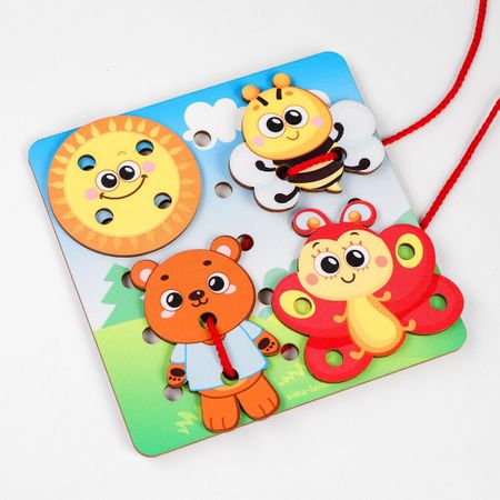 Шнуровка «Солнечная полянка». Деревянная шнуровка «Солнечная полянка» — это яркая и увлекательная игрушка, которая помогает детям от 3 лет развивать моторику, логическое мышление и знакомиться с миром. Состоит из деревянной основы в виде поляны и разноцветных элементов, которые малыш прикрепляет с помощью шнуровки. <b> Особенности</b> <ul> <li> Игрушка выполнена из натурального дерева, что делает ее экологичной, безопасной и долговечной.</li> <li> Яркие фигурные детали привлекают внимание ребенка и помогают запомнить их цвета, формы и расположение на дереве.</li> <li> Простая задача: пришнуровать детали к основе, обучая малыша навыкам шнурования и различению форм и размеров.</li> <li> Подходит для мальчиков и девочек, идеально дополняя игровую зону дома или в детском саду.</li> <li> Качественная обработка дерева гарантирует безопасность для детских рук, а компактный размер удобен для хранения и переноски.</li> </ul> <b> Чем полезна эта шнуровка</b> «Солнечная полянка» помогает ребенку освоить важные навыки: координацию движений, логику и мелкую моторику. Играя с элементами, малыш учится различать формы, цвета и размеры, а также развивает память и воображение. Это не только занимательное занятие, но и источник новых знаний, которые формируют базовые когнитивные навыки. Каждый этап игры стимулирует самостоятельность и уверенность в своих силах.
