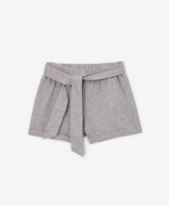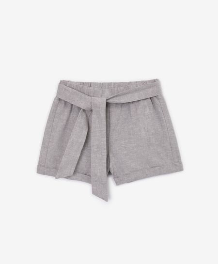 Серые текстильные шорты с отворотами, выполненные из серой меланжевой ткани с преимущественным содержанием льна, выглядят стильно, благородно, изысканно. Хлопок в составе ткани улучшает тактильный контакт, снижает сминаемость изделия. Неброский цвет, лаконичный дизайн, отсутствие ярких отделок делают шорты элегантными, идеально подходящими и к повседневному, и к нарядному образу девочки. С любой футболкой, блузкой, жакетом, льняные шорты составят красивый интеллигентный комплект, подчеркнув нежность и обаяние своей обладательницы. Шорты на резинке дополнены поясом, с помощью которого можно сформировать четкий красивый бант, а также завязать его на узел с ниспадающими концами. Он также поможет отрегулировать объем талии для девочек худощавого телосложения.