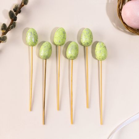 Шпажки на пасху «Яйцо пасхальное», зеленая, набор 6 шт.. Шпажки в виде пасхальных яиц – стильный аксессуар для праздничного стола на Пасху. Набор создаст атмосферу тепла и уюта. Он идеально подойдет для оформления блюд, подачи закусок или канапе. <b> Особенности</b> <ul> <li> Длина шпажки — 12,5 см.</li> <li> В наборе 6 шпажек.</li> </ul> Этот набор также станет отличным подарком для друзей или близких на Пасху. Подарите им эти аксессуары, чтобы они могли добавить красоты и изысканности в свои столовые украшения. Шпажки не только практичны, но и красиво дополнят интерьер вашего стола во время праздника. Шпажки помогут создать атмосферу радости и праздника. Они подойдут для пасхальных обедов, приемов гостей или домашних вечеров в кругу семьи.