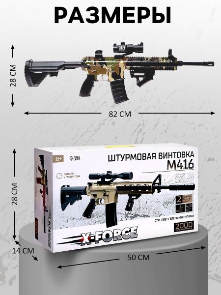 Штурмовая винтовка M416, стреляет орбизами, работает от аккумулятора. Штурмовая винтовка M416 — это надежное оружие, которое позволит ребенку почувствовать себя настоящим бойцом. «Эмка» стреляет гелевыми пулями. Такие снаряды лопаются при столкновении, не оставляют следов и не причиняют вреда. <b> Особенности автомата</b> <ul> <li> Длина оружия — 82 см.</li> <li> Два режима работы: ручной и автоматический.</li> <li> Подробная инструкция расскажет, как подготовить снаряды для стрельбы.</li> <li> M416 можно разобрать на части: ствол, оптический прицел, магазин, корпус, приклад, глушитель.</li> </ul> <b> Комплектация</b> <ul> <li> Защитные очки.</li> <li> 2 000 гелевых пуль 7–8 мм.</li> <li> Ёмкость для подготовленных пуль.</li> <li> Глушитель.</li> <li> Прицел.</li> <li> Лямка.</li> <li> Инструкция.</li> <li> Аккумулятор 7,4 В.</li> <li> Кабель USB для зарядки аккумулятора.</li> </ul> <b> Увлекательно и полезно!</b> Игры со штурмовой винтовкой M416 помогут развить у ребенка: <ul> <li> моторику и координацию движений, благодаря необходимости прицеливания и наведения на цель;</li> <li> коммуникативные навыки, так как игра с друзьями требует совместной работы и общения;</li> <li> воображение и творческие способности при создании игровых сценариев и стратегий.</li> </ul>