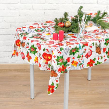 Скатерть новогодняя одноразовая, размер 108х180 см. Скатерть станет настоящим украшением праздничного стола! Яркая расцветка и тематический дизайн добавят сервировке торжественных ноток и разбудят аппетит. Скатерть из ПВХ удобна в использовании: с нее легко удалять пятна, а после застолья не нужно стирать — достаточно просто протереть. Такое нарядное убранство позволит всем гостям настроиться на позитивную волну!
