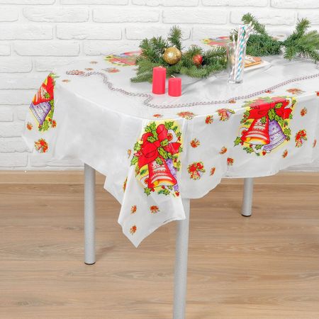 Скатерть новогодняя одноразовая «Колокольчики», 108×180 см. Скатерть станет настоящим украшением праздничного стола! Яркая расцветка и тематический дизайн добавят сервировке торжественных ноток и разбудят аппетит. Скатерть из ПВХ удобна в использовании: с нее легко удалять пятна, а после застолья не нужно стирать — достаточно просто протереть. Такое нарядное убранство позволит всем гостям настроиться на позитивную волну!