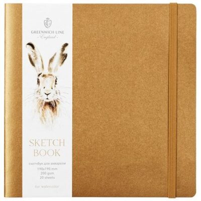 Скетчбук для акварели Greenwich Line состоит из 20 листов акварельной бумаги плотностью 200 г/м2, тип скрепления – сшивка. Удобный размер 190*190 мм позволяет взять скетчбук с собой и делать зарисовки на улице и в путешествии. Квадратный формат является оптимальным для творчества, так как симметричные композиции на нем смотрятся гораздо интереснее и гармоничнее. Мягкая обложка из дизайнерского картона золотого цвета фиксируется резинкой в тон.Скетчбук Greenwich Line – ваша уютная мастерская, на страницах которой вы можете размышлять в виде набросков или заметок.• Формат: 190*190 мм;• Кол-во листов: 20;• Техника (назначение): для акварели;• Вид скрепления: сшивка;• Цвет внутреннего блока: белый;• Плотность блока: 200 г/м2.