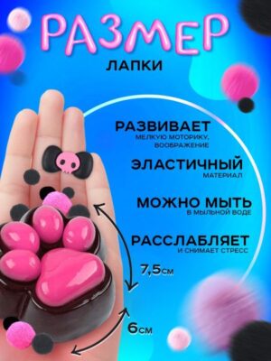 Сквиш антистресс — игрушка «Мяк-жмяк. Лапка», черный. Игрушка-антистресс «Мяк-жмяк. Лапка» — это мягкая мялка в форме лапки, созданная для снятия стресса и улучшения настроения. Она станет отличным компаньоном для детей и взрослых, помогая отвлечься от забот и расслабиться. Черный и ярко-розовый цвет делает ее особенно привлекательной для детей. <b> Особенности</b> <ul> <li> Подходит для детей от 3 лет — безопасный и увлекательный аксессуар для игр.</li> <li> Изготовлена из мягкого, приятного на ощупь материала, который легко мнется и возвращается в исходную форму.</li> <li> Удобный размер позволяет носить ее с собой — в кармане или рюкзаке.</li> <li> Мялка способствует развитию моторики рук и помогает снять напряжение после длительных занятий.</li> </ul> <b> Игры с пользой</b> Мялка-антистресс помогает расслабиться, тренирует мелкую моторику и тактильные ощущения. Она станет идеальным аксессуаром для снятия напряжения. Игрушка-антистресс «Мяк-жмяк. Лапка» — это не просто мялка, а верный помощник для хорошего настроения и активного отдыха!