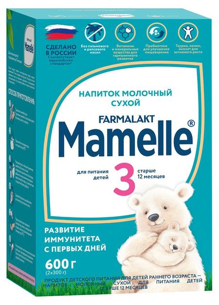 Смесь сухая молочная адаптированная начальная Mamelle 3 для детей с 12 месяцев — это сбалансированный состав смеси без пальмового и рапсового масел, обогащенный нуклеотидами, витаминами и минералами. Продукция производится на новейшем современном заводе с соблюдением передовых технологий, а также высоких требований к сырью и качеству детского питания.