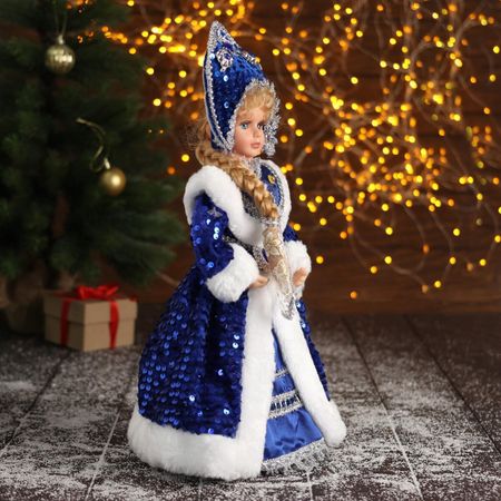 Снегурочка под елку «Зимнее волшебство. В синей шубке и кокошнике», 35 см. Снегурочка «В синей шубке и кокошнике» — это стильный и доброжелательный акцент для новогоднего убранства. Фигурка высотой 35 см выполнена в синем цвете, дополнена кокошником и создана в духе советского дизайна с современным фьюжн-подходом. Это украшение для тех, кто ценит свет, форму и атмосферу зимнего праздника без излишней вычесленности. <b> Особенности</b> <ul> <li> Персонаж — Снегурочка, неизменная спутница Нового года и образ доброты, тепла и ожидания чуда.</li> <li> Тематика — Новый год, где каждый элемент декора работает на общий праздник и семейное тепло.</li> <li> Цвет — синий, напоминающий морозные узоры и создающий фон для других световых акцентов в оформлении.</li> <li> Стиль — сочетание советской эстетики и современного фьюжн в одной логичной и мягкой форме.</li> <li> Для кого — унисекс-декор, подходящий как мужчинам, так и женщинам, собирающим зимние композиции.</li> </ul> <b> Праздник начинается с одного взгляда на Снегурочку</b> Эта фигурка делает елку частью вашей личной зимней истории. Синие тона и классические формы работают вместе, чтобы передать атмосферу покоя, семейного уюта и предпраздничного ожидания. Используйте ее как центральный элемент или фоновое дополнение — одинаково хорошо усиливает дух торжества и доброжелательность дома.
