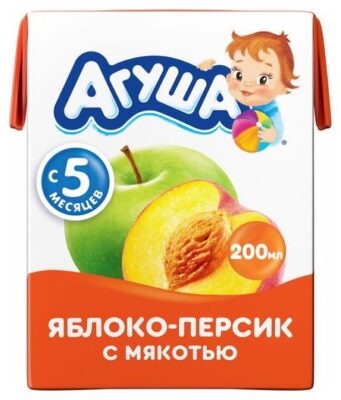 Детям с 5 месяцев Сок Агуша Яблоко и персик с мякотью с 5 мес 200 мл. Яблоко — источник фруктовых кислот, железа, витамина С. Сочетание железа и витамина С способствует наилучшему всасыванию железа, что является профилактикой анемии. Пектины и фруктовые кислоты в яблоке мягко стимулируют деятельность кишечника. Плоды персика содержат витамины группы B, витамин С, калий, магний, железо, фосфор, медь, пектин и очень много каротина. Каротин улучшает обмен веществ и повышает иммунитет, а калий необходим для работы сердца, сокращения мышц, деятельности нервной системы. В персиках много пищевых волокон, которые регулируют деятельность кишечника, отлично справляясь с запорами. Предусматривает 72 проверки качества продукта от сбора фруктов, производства, упаковки до доставки в магазин. Без добавления сахара. Содержит сахара природного (естественного) происхождения. Без консервантов, красителей и ГМО. Способ употребления: Рекомендуется начинать с 0,5 чайной ложки, постепенно увеличивая к 12 месяцам до 100 г в день.