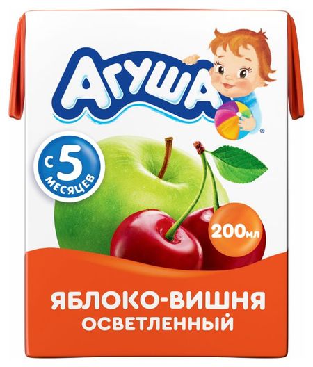 Сок Агуша Яблоко-вишня осветленный 200мл изготовлен исключительно из яблочного и вишневого сока без добавления сахара, консервантов и красителей. Как и вся продукция бренда, проходит 72 проверки качества — от сбора урожая до доставки в магазины. Рекомендуется давать детям с 5-месячного возраста, начиная с 0,5 чайной ложки в день, постепенно увеличивая к 12 месяцам до 100 грамм. Обратите внимание: перед введением нового продукта в рацион ребенка обязательно проконсультируйтесь с вашим педиатром!