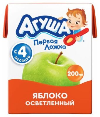 Сок Агуша Яблоко осветленный 200мл изготовлен исключительно из сока спелых яблок без добавления сахара, консервантов и красителей. Как и вся продукция бренда, проходит 72 проверки качества — от сбора урожая до доставки в магазины. Рекомендуется давать детям с 4-месячного возраста, начиная с 0,5 чайной ложки в день, постепенно увеличивая к 12 месяцам до 100 грамм. Такую упаковку удобно брать с собой на прогулку. Обратите внимание: перед введением нового продукта в рацион ребенка обязательно проконсультируйтесь с вашим педиатром!