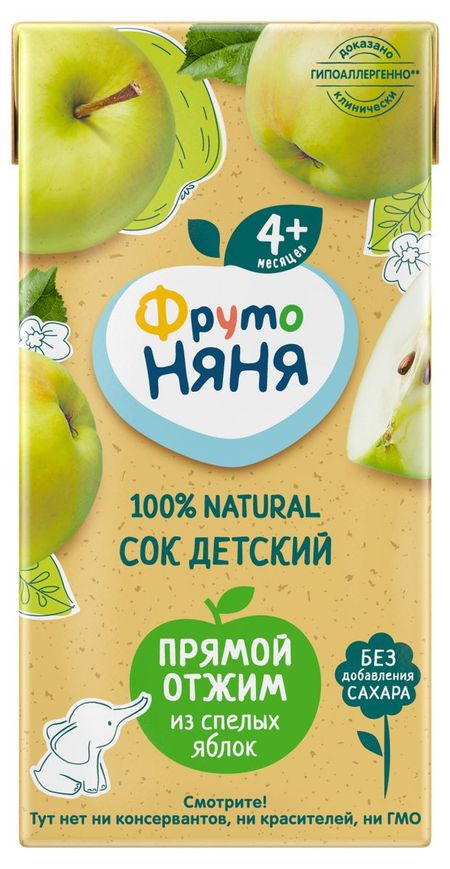Яблочный сок ФрутоНяня прямого отжима на 100% натуральный продукт, в производстве которого используются только свежие наливные яблочки и ничего лишнего. Это идеальное дополнение здорового рациона малышей от 4 месяцев. Технология прямого отжима позволяет сохранить максимум пользы и натуральные вкусовые качества яблочного сока. Поэтому он такой сладкий даже без добавления сахара и очень нравится детям. Сок из яблок прямого отжима ФрутоНяня гипоаллергенный, что подтверждено клинически.