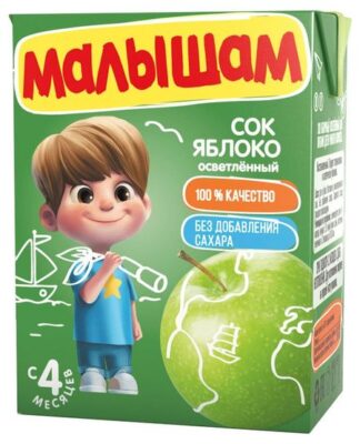 Детям с 4 месяцев. Сок ФрутоНяня Малышам Яблоко с 4 мес 200 мл. Яблочный сок рекомендуется вводить одним из первых в рацион малыша. Яблоко содержит пектин, который способствует правильной работе кишечника. Железо и витамин С, содержащиеся в яблоке, помогут в борьбе с железодефицитом. Яблоко усиливает кроветворение, очищает организм от вредных веществ, снижает уровень холестерина. Без добавления сахара. Содержит сахара природного происхождения. Без консервантов, красителей и ГМО. Способ употребления: рекомендуется начинать с 0,5 чайной ложки 2 раза в день, увеличивая к 12 месяцам до 80-100 мл в день. Перед употреблением взбалтывать.