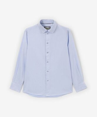 Голубая рубашка с длинным рукавом прилегающего силуэта(slim fit) – незаменимая вещь для школьного гардероба и торжественных случаев в жизни мальчика. Без нее невозможно представить деловые образы и комплекты в стиле смарт кэжуал, построенные на минимализме, лаконичности, аристократической сдержанности. Рубашка выполнена из легкого, тактильно приятного хлопкового текстиля. Застежка на кнопки с имитацией пуговиц делает ее удобной и практичной, простой в повседневной эксплуатации. Рубашка отлично сочетается с текстильными и трикотажными школьными брюками, джинсами, модными трикотажными жилетами, кардиганами, пиджаками.