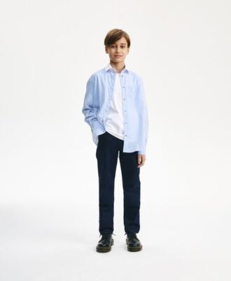 Голубая сорочка с длинным рукавом прямого комфортного силуэта(relaxed fit) – прекрасный вариант для школьного гардероба мальчика. Сорочка выполнена из хлопкового текстиля, очень приятного при тактильном контакте. Он формоустойчив, гигроскопичен, воздухопроницаем, обеспечивает комфортную эксплуатацию изделия на протяжении всего дня. Супатная планка, скрывающая удобную застежку на кнопки, и контрастный белый воротник подчеркивают минималистичный дизайн модели, делают сорочку свежей, нарядной, оптимальной для школьных образов и не только. Она легко комбинируется с классическими брюками, строгими джинсами, жилетами и пиджаками, создавая безупречные комплекты в деловом стиле.