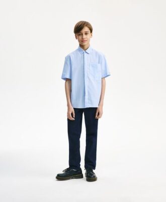 Голубая сорочка с коротким рукавом прямого комфортного силуэта(relaxed fit) – прекрасный вариант для школьного гардероба мальчика. Сорочка выполнена из хлопкового текстиля, очень приятного при тактильном контакте. Он гигроскопичен, обладает отличной воздухопроницаемостью, обеспечивая комфортную эксплуатацию изделия на протяжении всего дня. Супатная планка, скрывающая удобную застежку на кнопки, подчеркивает минималистичный дизайн модели, делают сорочку идеальной для школьных образов и не только.