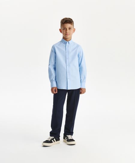 Голубая сорочка с длинным рукавом – важнейшая составляющая школьного гардероба. Рубашка прямого силуэта(regular fit) выполнена из фактурного хлопкового текстиля, очень приятного при тактильном контакте. Он мягок, гигроскопичен, обладает отличной воздухопроницаемостью, обеспечивая комфортную эксплуатацию изделия на протяжении всего дня. Минималистичный дизайн модели делает рубашку универсальным вариантом не только для школьных образов, но и для повседневных комплектов. Школьная сорочка легко комбинируется с классическими брюками, прямыми джинсами, очень удобна для ношения под пиджак, прекрасно смотрится с жилетами, трикотажными и вязаными кардиганами. Сорочка застегивается на пуговицы.
