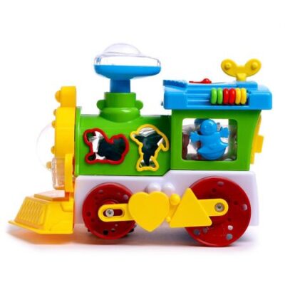 Сортер «Веселый паровозик», свет, звук. Сортер «Веселый паровозик» развивает музыкальное, визуальное восприятие, мелкую моторику рук, воображение. Паровозик имеет отверстия для геометрических блоков, внутри которых находятся фрукты. С помощью игрушки малыш выучит фрукты и цвета. Игрушка меняет направление движения при столкновении с препятствиями. Мигают фары и фонарь.