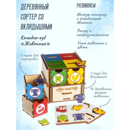 Деревянный комодик «Животные» — это увлекательная игра для детей от 3 лет, которая помогает изучать животных, цвета и развивать логическое мышление. В комплекте 16 фигурок животных, ящик для вкладышей и 4 ящика для сортировки.ОсобенностиИзготовлен из натурального дерева, что делает его безопасным, экологичным и долговечным.Каждая фигурка представляет собой яркое изображение животного, что привлекает внимание малышей и стимулирует интерес к игре.Простая механика: ребёнок сортирует фигурки по цветам или другим признакам, раскладывая их по соответствующим ящикам.Компактный размер идеально подходит для игр дома или в детском саду.Подходит для мальчиков и девочек, дополняя развивающую среду функциональными и познавательными элементами.Чем полезен этот комодик«Животные» помогают ребёнку освоить важные навыки: различать животных, цвета и формы, развивать логическое мышление и мелкую моторику. Играя с фигурками, малыш учится выполнять последовательные действия, тренирует внимание и терпение. Задача сортировки по ящикам стимулирует сообразительность и координацию движений. Это не только занимательное занятие, но и источник новых знаний, которые формируют базовые когнитивные навыки. Каждый этап игры стимулирует самостоятельность и уверенность в своих силах.