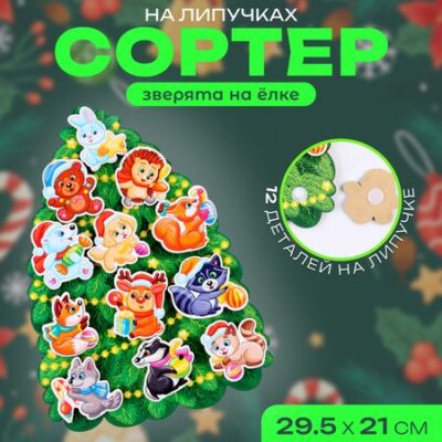 Новогодний сортер «Зверята на ёлке» — увлекательное развивающее занятие на Новый год, которое направлено на закрепление определённых знаний: форма, цвет, предмет и другое. Во время игры с сортером ребёнок осваивает такие понятия как «разный» и «одинаковый», учится сравнивать, делать выбор.Разложите перед ребёнком фигурки и ёлочку. Предложите малышу найти для каждой фигурки подходящее место на ёлочке.Предложите малышу заполнить ёлку фигурками одного цвета, с одинваковыми подарками в лапках или игрушками.Вы также можете использовать фигурки для липучек (для этого на них есть мягкая сторона липучки).Деревянные игрушки способствуют развитию:Воображения.Логического мышления.Координации движений.Мелкой моторики.Цветового восприятия.Простора для творчества.