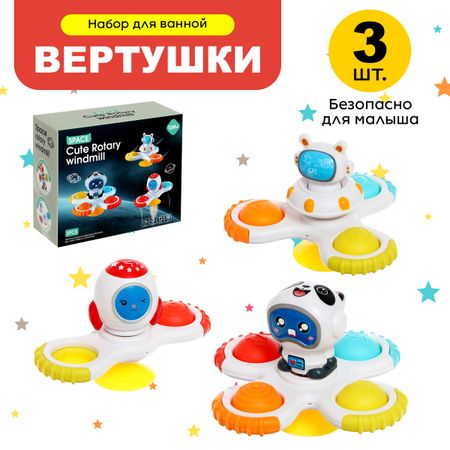 Спиннеры для купания на присосках «Космос», набор 3 шт.. Набор из трех разноцветных спиннеров на присосках «Космос» станет отличным выбором для игр в ванной. Эти игрушки понравятся детям от 1 года, превращая купание в увлекательное приключение. Игрушки легко крепятся к любой гладкой поверхности благодаря прочным присоскам. <b> Особенности</b> <ul> <li> Три спиннера в одном наборе — разнообразие форм и цветов увлекает ребенка.</li> <li> Прочные присоски обеспечивают надежное крепление к ванной, плитке или стеклу.</li> <li> Изготовлено из качественного пластика, подходящего для детей младшего возраста.</li> <li> Подходит для развития мелкой моторики и координации движений.</li> </ul> <b> Как играть</b> Просто закрепите спиннеры на гладкой поверхности и покажите ребенку, как они вращаются. Используйте их для обучения цветов и форм. Игрушки способствуют развитию фантазии и превращают процесс купания в веселую игру. <b> Развиваемся играя</b> Набор спиннеров на присосках — это не только развлечение, но и развитие. Игрушки помогают ребенку тренировать мелкую моторику, изучать окружающий мир и получать удовольствие от водных процедур.