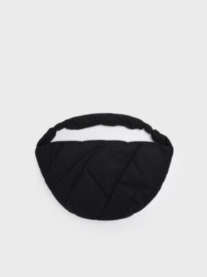 Трендовая женская дутая сумка с оригинальной простежкой. Форма полумесяц. Яркая подкладка является акцентной деталью этой модели. Сумку можно носить как на плече, так и как кросс-боди. Сумка закрывается на молнию. Внутри есть карман на молнии для документов. Параметры: высота — 28 см, ширина — 56 см, глубина — 15 см.