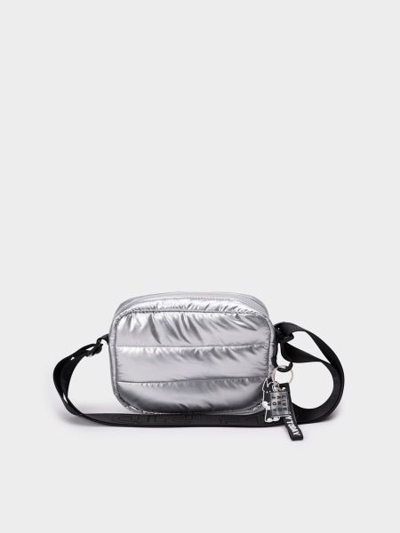 Дутая серебряная сумка кросс-боди для девочки-подростка. Декорирована трендовым фирменным брелоком-навесом. Регулируемый брендированный ремень. Основной отсек на молнии, внутри карман для телефона и карман на молнии. Параметры: высота — 15 см, ширина -21 см, глубина — 5 см.