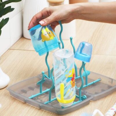Сушилка для детских бутылочек, бирюзовая. Особенности Сушилка станет полезным аксессуаром на вашей кухне. Данный прибор позволяет просушить одновременно разные по диаметру бутылочки, а также соски, крышечки и. т. д. Изделие непременно порадует простотой и комфортом в использовании. Вода, скопившаяся в поддоне сушилки, легко сливается. Модель эргономична, удобно складывается и раскладывается.