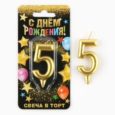 Свеча для торта, цифра «5», золото, 3 х 6 см. Свечи для торта на День рождения — неотъемлемая часть праздника. Украсьте угощение свечами, чтобы сделать особенный день в году еще более ярким и незабываемым. Ведь задувание свечей вызывает бурные эмоции и у взрослых, и у детей, потому что в любом возрасте мы все мечтаем об исполнении желаний и для всех нас это один из самых трогательных и волшебных моментов. Яркие свечи украсят праздничный стол и создадут нужную атмосферу. Изготовлены из высокоочищенного пищевого парафина, который не влияет на вкусовые качества блюд, а удобная упаковка помогает сохранять свечи при длительном хранении и транспортировке.