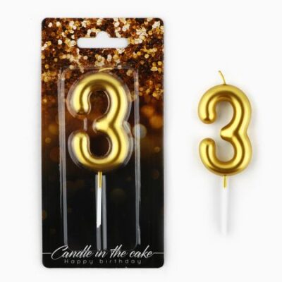 Свеча для торта, цифра «3», золото, 9,5 х 4 см. <b> Свеча для торта, цифра «3», золото, 9,5 х 4 см</b> Свечи для торта на День рождения — неотъемлемая часть праздника. Украсьте угощение свечами, чтобы сделать особенный день в году еще более ярким и незабываемым. Ведь задувание свечей вызывает бурные эмоции и у взрослых, и у детей, потому что в любом возрасте мы все мечтаем об исполнении желаний и для всех нас это один из самых трогательных и волшебных моментов. Яркие свечи украсят праздничный стол и создадут нужную атмосферу. Изготовлены из высокоочищенного пищевого парафина, который не влияет на вкусовые качества блюд, а удобная упаковка помогает сохранять свечи при длительном хранении и транспортировке.