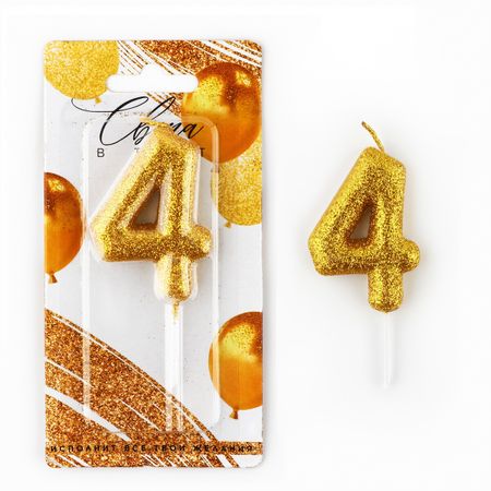 Свеча для торта, цифра, блестящая «4», золото, 9,5 х 4 см. <b> Свеча для торта, цифра, блестящая «4», золото, 9,5 х 4 см</b> Свечи для торта на День рождения — неотъемлемая часть праздника. Украсьте угощение свечами, чтобы сделать особенный день в году еще более ярким и незабываемым. Ведь задувание свечей вызывает бурные эмоции и у взрослых, и у детей, потому что в любом возрасте мы все мечтаем об исполнении желаний и для всех нас это один из самых трогательных и волшебных моментов. Яркие свечи украсят праздничный стол и создадут нужную атмосферу. Изготовлены из высокоочищенного пищевого парафина, который не влияет на вкусовые качества блюд, а удобная упаковка помогает сохранять свечи при длительном хранении и транспортировке.