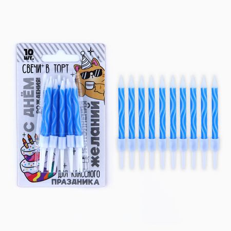 Свечи для торта «С Днем Рождения», голубые, 10 шт., 7,5 х 0,5 см. Свечи для торта — это неотъемлемый атрибут праздника. Набор свечей станет прекрасным украшением торта и других кондитерских изделий по случаю дня рождения, юбилея и любого другого торжества. Украсьте угощение стильными свечами, чтобы сделать особенный день еще более ярким и незабываемым. Для того, чтобы свечи не задувались, им нужно дать 60 секунд разгореться, после чего их можно будет задувать, но уже через несколько секунд, как они погаснут, свечи загорятся снова. Для того,чтобы свечи все-таки потушить, их рекомендуется примочить водой или придавить фитиль свечи. Изготовлены из высокоочищенного пищевого парафина, который не влияет на вкусовые качества блюд, а удобная упаковка помогает сохранять свечи при длительном хранении и транспортировке.