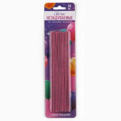 Свечи для торта незадуваемые, розовые, 24 шт., 16,8 х 0,3 см. Свечи для торта — это неотъемлемый атрибут праздника. Набор свечей станет прекрасным украшением торта и других кондитерских изделий по случаю дня рождения, юбилея и любого другого торжества. Украсьте угощение стильными свечами, чтобы сделать особенный день еще более ярким и незабываемым. Для того, чтобы свечи не задувались, им нужно дать 60 секунд разгореться, после чего их можно будет задувать, но уже через несколько секунд, как они погаснут, свечи загорятся снова. Для того,чтобы свечи все-таки потушить, их рекомендуется примочить водой или придавить фитиль свечи. Изготовлены из высокоочищенного пищевого парафина, который не влияет на вкусовые качества блюд, а удобная упаковка помогает сохранять свечи при длительном хранении и транспортировке.
