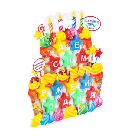 Свечи для торта звездочки «С днем рождения», 18.5×7.5 см. Свечи для торта — это неотъемлемый атрибут праздника. Набор свечей станет прекрасным украшением торта и других кондитерских изделий по случаю дня рождения, юбилея и любого другого торжества. Украсьте угощение стильными свечами, чтобы сделать особенный день еще более ярким и незабываемым. Для того, чтобы свечи не задувались, им нужно дать 60 секунд разгореться, после чего их можно будет задувать, но уже через несколько секунд, как они погаснут, свечи загорятся снова. Для того,чтобы свечи все-таки потушить, их рекомендуется примочить водой или придавить фитиль свечи. Изготовлены из высокоочищенного пищевого парафина, который не влияет на вкусовые качества блюд, а удобная упаковка помогает сохранять свечи при длительном хранении и транспортировке.
