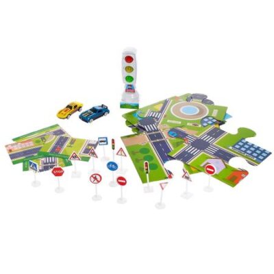 Светофор с игровым полем «Изучаем ПДД», световые эффекты, русский чип. С набором «Изучаем ПДД» прогулки на улице станут для малыша безопаснее. Благодаря дорожным пазлам, которые сделают игру реалистичнее и интереснее, ребенок сможет собрать собственный город и следить за движением машин. Набор поможет ребенку в игровой форме изучить правила дорожного движения и узнать, как вести себя на проезжей части. Машинки, дорожные знаки и светофор в наборе помогут воссоздать реальную ситуацию на дороге, придумать варианты развития событий и заранее обезопасить себя от чрезвычайных ситуаций. <b> Особенности</b> <ul> <li> Звуковые эффекты: светофор воспроизводит 2 песни, а также рассказывает о значении цветов.</li> <li> Световые эффекты: игрушка горит красным, желтым и зеленым светом.</li> <li> Светофор работает от 3 батареек типоразмера LR44 (есть в комплекте).</li> <li> Предметы сделаны из металла и качественного высококачественного пластика, что гарантирует их долговечность и делает абсолютно безопасными для детей.</li> </ul> <b> Играем с пользой</b> Набор «Изучаем ПДД» поможет развить мелкую моторику рук, логическое мышление, фантазию и память малыша. Ребенок узнает правила дорожного движения и поведения на проезжей части.