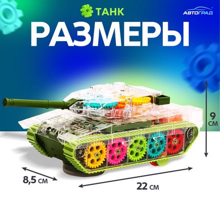 Танк «Шестеренки», свет и звук, работает от батареек, цвет зеленый. Танк «Шестеренки» — детально проработанный транспорт. Машинка дополнит игрушечную коллекцию и станет прекрасным подарком для маленького любителя техники. <b> Особенности танка</b> <ul> <li> Игрушка выполнена и пластика с использованием безопасных красителей.</li> <li> Благодаря прозрачному корпусу танка ребенок сможет наблюдать за движениями механизмов внутри игрушки.</li> <li> Воспроизводятся звуки работы танка, выстрелов и взрывов.</li> <li> Башня танка автоматически вращается на 45 градусов.</li> <li> Игрушка ездит самостоятельно. Можно катать руками. При движении активируются световые эффекты — танк светится изнутри разными цветами.</li> </ul> <b> Неоспоримая польза</b> Сюжетно-ролевые игры с игрушечным транспортом способствуют развитию воображения, мышления и эмоционального восприятия. Товар предназначен для детей старше 3 лет.