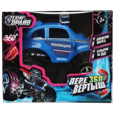 ТЕХНОДРАЙВ 1408B084-R. Машина-перевертыш «Полиция» ТМ «Технодрайв» станет отличным подарком для вашего ребенка:<br> — 4 больших колеса<br> — движение вперед<br> — кувырок на 360 градусов<br> <br> Яркая машина-перевертыш непременно понравится юному автолюбителю. Рельефные колеса гарантируют крепкое сцепление с поверхностью и предохраняют от «аварий» во время быстрой езды. При столкновении с препятствием игрушка эффектно переворачивается на 360 градусов.<br> <br> Игра с машинкой-перевертышем ТМ «Технодрайв» тренирует:<br> — координацию движений<br> — внимание<br> — ловкость<br> <br> Размер: 10 х 10 х 10 см. Материал: пластмасса + металл.<br> Работает от 2-х батареек типа АА.<br> Рекомендовано детям старше 3-х лет.