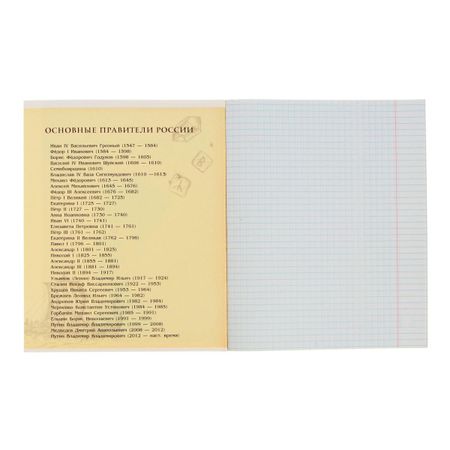 Тетрадь предметная 36 листов в клетку Calligrata, «Предметы. История», обложка мелованный картон. Предметные тетради — это находка для любого школьника и его родителей. <b> Особенности:</b> <ul> <li> Имеют вкладыш со справочными материалом, содержащим сжатую, но емкую информацию. Такие подсказки, безусловно, помогут каждому ученику быстро освежить свои знания.</li> <li> Плотные белые листы и хорошо пропечатанная внутренняя разметка делают тетрадь прекрасным выбором на весь учебный год.</li> <li> Приятный и оригинальный дизайн был создан на основе предпочтений как детей, так и родителей.</li> <li> Количество листов позволит хранить как можно больше информации в одной тетради, при этом не занимая много пространства и не доставляя неудобств как ребенку, так и учителю.</li> </ul> <b> Характеристики:</b> <ul> <li> Объем: 36 листов.</li> <li> Тип: предметная.</li> <li> Со справочным материалом.</li> <li> Формат: А5.</li> <li> Прямые углы.</li> </ul> Данная тетрадь подходит для учащихся средних и старших классов. Уважаемые покупатели! Данные тетради могут иметь технологическую особенность в виде незначительного надрыва нижней части корешка, вдавленной полосы внизу тетради.