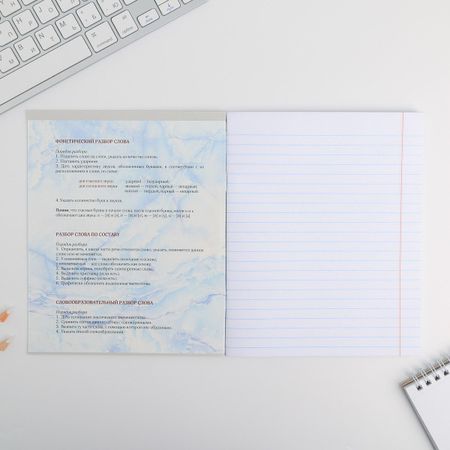Тетрадь в линейку, предметная, 48 л.,на скрепке, А5 «МРАМОР. Русский язык». Предметная тетрадь торговой марки ArtFox STUDY- незаменимый помощник в учебе! <ul> <li> Формат: А5;</li> <li> Тип скрепления: на скобе;</li> <li> Количество листов: 48;</li> <li> Материал обложки: мелованный картон;</li> <li> Особенности: со справочным материалом;</li> <li> Вид обложки: мягкая.</li> </ul>