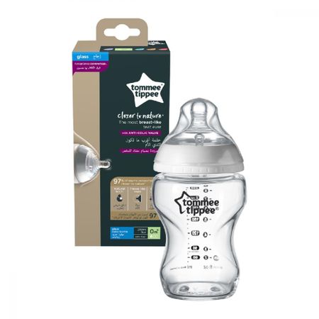 At a glanceTommee Tippee has designed the easy-latch-on teat shape with breastfeeding experts to mimic the natural flex, stretch and movement of a mumFeatures and benefitsOur award-winning range of BPA-free baby bottles has been designed with breastfeeding experts to encourage your babys natural feeding action. And weve designed all the accessories and equipment you need to make life easier for you too.Tommee Tippee has designed the easy-latch-on teat shape with breastfeeding experts to mimic the natural flex, stretch and movement of a mum1 Glass BottleClearDishwasher Safe Top RackGlass Bottle May Break If Dropped. Always Use This Product With Adult Supervision. Do Not Leave Baby Alone With Drinking Equipment Due To The Risk Of Choking, Baby Falling Or If The Product Has Disassembled. Never Use Feeding Nipples As A Pacifier. Always Check Food Temperature Before Feeding. Do Not Heat In A Microwave. Always Stir Heated Food To Ensure Even Heat Distribution And Test The Temperature Before Serving. For Your ChildS Safety Always Check Food Temperature Before Feeding By Testing On A Sensitive Part Of Your Skin. For Example On The Inside Of Your Wrist.1580.68SpecificationsColor: TransparentProduct brand: Tommee TippeeWhat’s In The Box1 Glass Bottle