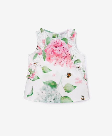Очаровательный текстильный топ — идеальное решение для жаркого лета. Выполненный из тонкого поплина с крупным цветочным рисунком, топ смотрится очень нежно, наивно, по-девичьи. Обаяние модели придают присборенные рюши, расположенные вдоль проймы спереди и сзади. Топ имеет удобную застежку-капельку на спинке.